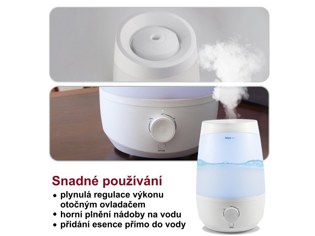 - 2v1 – zvlhčovač i aroma difuzér: uvolňuje jemnou mlhu s vůní, která zvlhčuje i větší místnost.